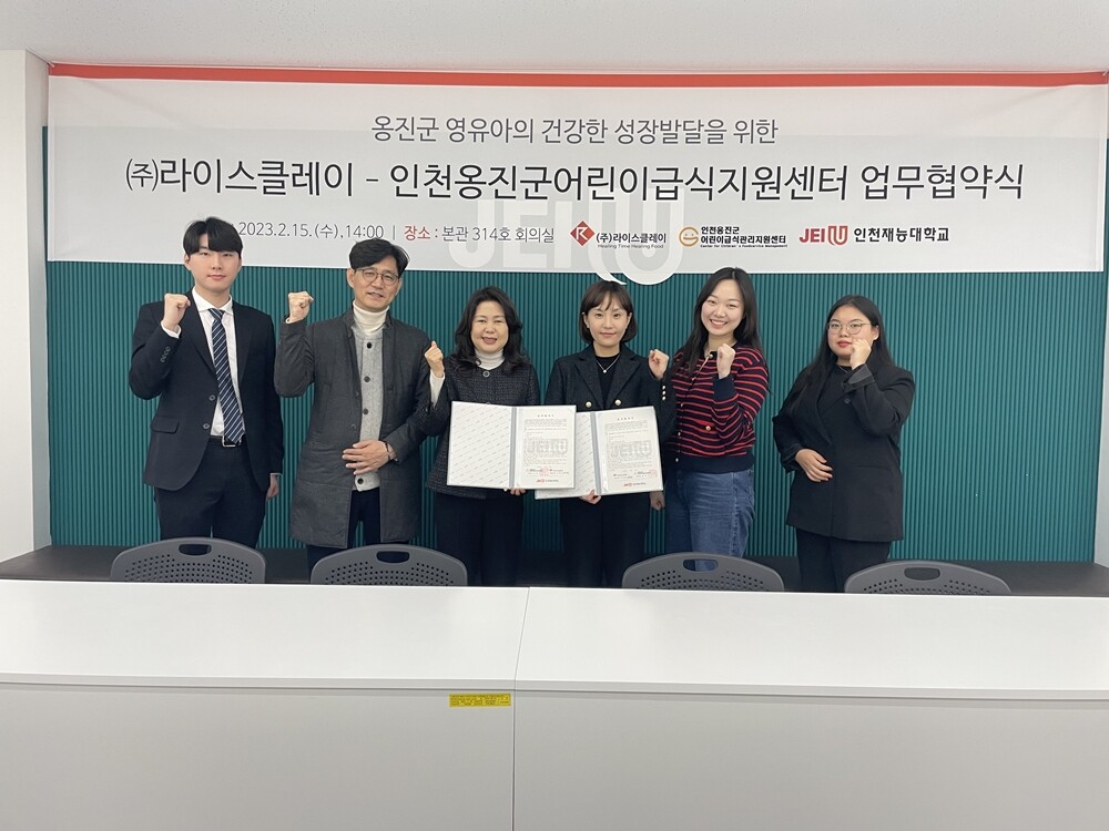 [대학저널 온종림 기자] 인천재능대학교가 위탁 운영하는 인천옹진군어린이급식관리지원센터와 ㈜라이스클레이가 15일 업무협약을 체결했다.
