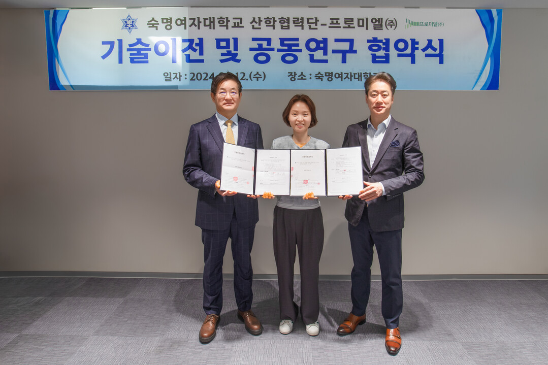 숙명여대 산학협력단은 6월 12일 서울 용산구 숙명여대 크로스캠퍼스 청파홀에서 프로미엘과 기술이전 및 공동연구 협약식을 개최했다. 숙명여대 인공지능공학부 임유진 교수와 프로미엘 송영국·박영만 대표를 비롯해 기술보증기금 서울서부기술혁신센터 등 유관기관 관계자 10여명이 참석했다.