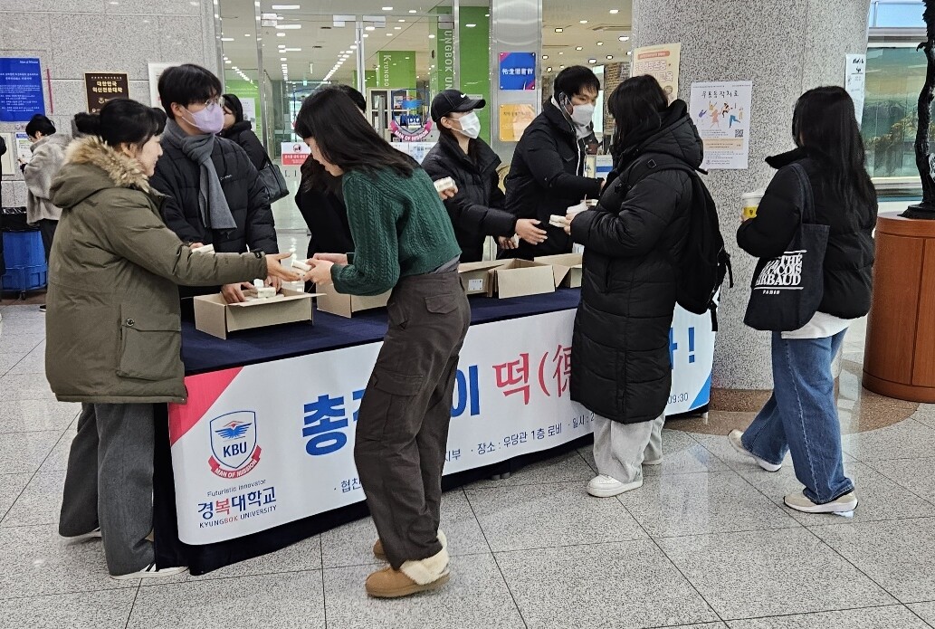 [대학저널 온종림 기자] 경복대학교가 지난 6일 남양주캠퍼스 우당관 로비에서 기말고사 준비에 여념이 없는 재학생들을 위해 ‘총장님이 떡(德) 쏜다’ 이벤트를 진행했다.