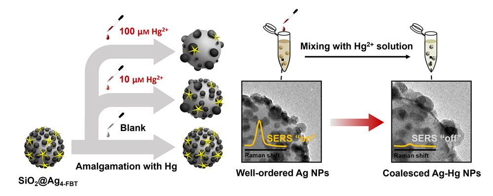 연구팀은 실리카-은 복합 나노소재가 수은에 반응하는 표면 구조에 주목해, 표면증강 라만분광법(Surface-Enhanced Raman Spectroscopy, SERS) 기반의 수은 검출법으로 활용했다.