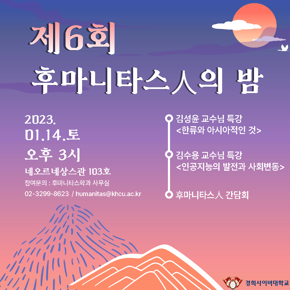 [대학저널 온종림 기자] 경희사이버대학교 후마니타스학과가 14일 네오르네상스관 103호에서 힘찬 새 학기 출정식으로 ‘후마니타스人의 밤’을 개최한다.