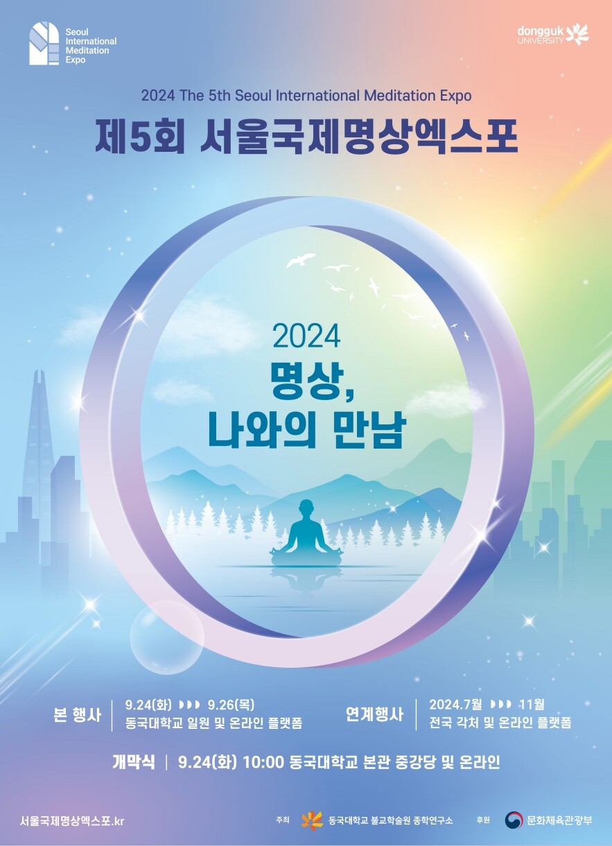 문화체육관광부 후원으로 진행되는 이번 엑스포는 9월 24~26일 동국대 서울캠퍼스 본관 중강당 및 캠퍼스 일대에서 열린다. ‘2024 명상, 나와의 만남’이라는 타이틀로 열리는 이번 행사는 ▲학술 ▲체험 ▲문화 ▲교육 ▲산업의 5가지 주제로 본격적인 명상의 장을 제공할 예정이다.