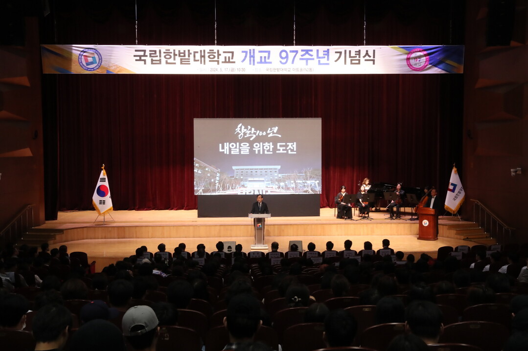 [대학저널 이선용 기자] 국립한밭대학교가 지난 17일 교내 아트홀에서 ‘개교 97주년 기념식’을 개최하고 자랑스러운 한밭대인, 대학발전 기여자, 근속 교직원 포상과 함께 ‘창학 100년, 국가 미래가치를 창출하는 혁신 플랫폼 대학’으로의 지속적인 노력을 다짐했다.