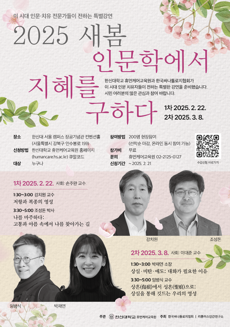 한신대 휴먼케어교육원이 주관하고, 한국싸나톨로지협회와 리플러스연구소가 공동 주최하는 이번 강연은 인문학에 대한 관심이 있는 학생과 지역 주민을 대상으로 깊은 인문학적 통찰과 치유의 메시지를 전달하고, 마음의 치유를 얻을 수 있는 기회를 제공하기 위해 마련됐다.