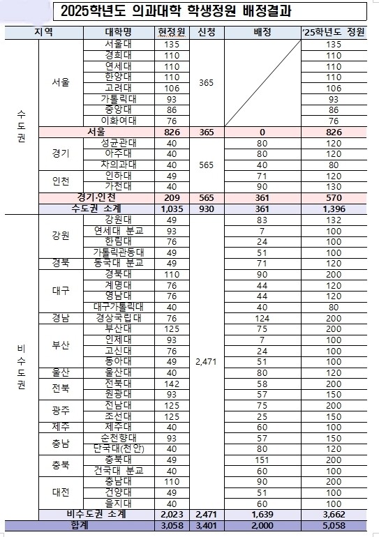 이번 증원으로 비수도권 의대 정원은 전체 의대 정원(5058명)의 72.4%까지 높아진다.