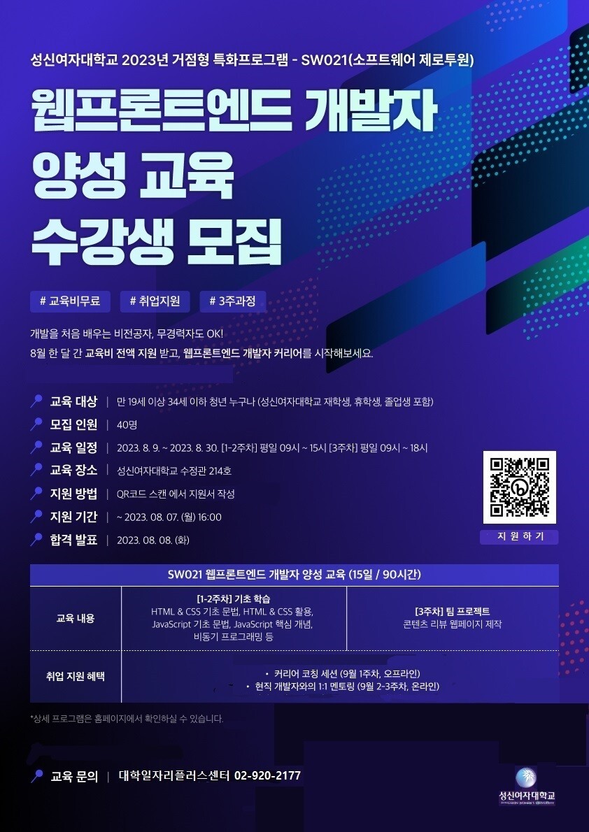 [대학저널 온종림 기자] 성신여자대학교가 청년의 소프트웨어 분야 취업역량 강화를 위해 오는 ‘웹 프론트엔드 개발자 양성 과정’을 운영한다.