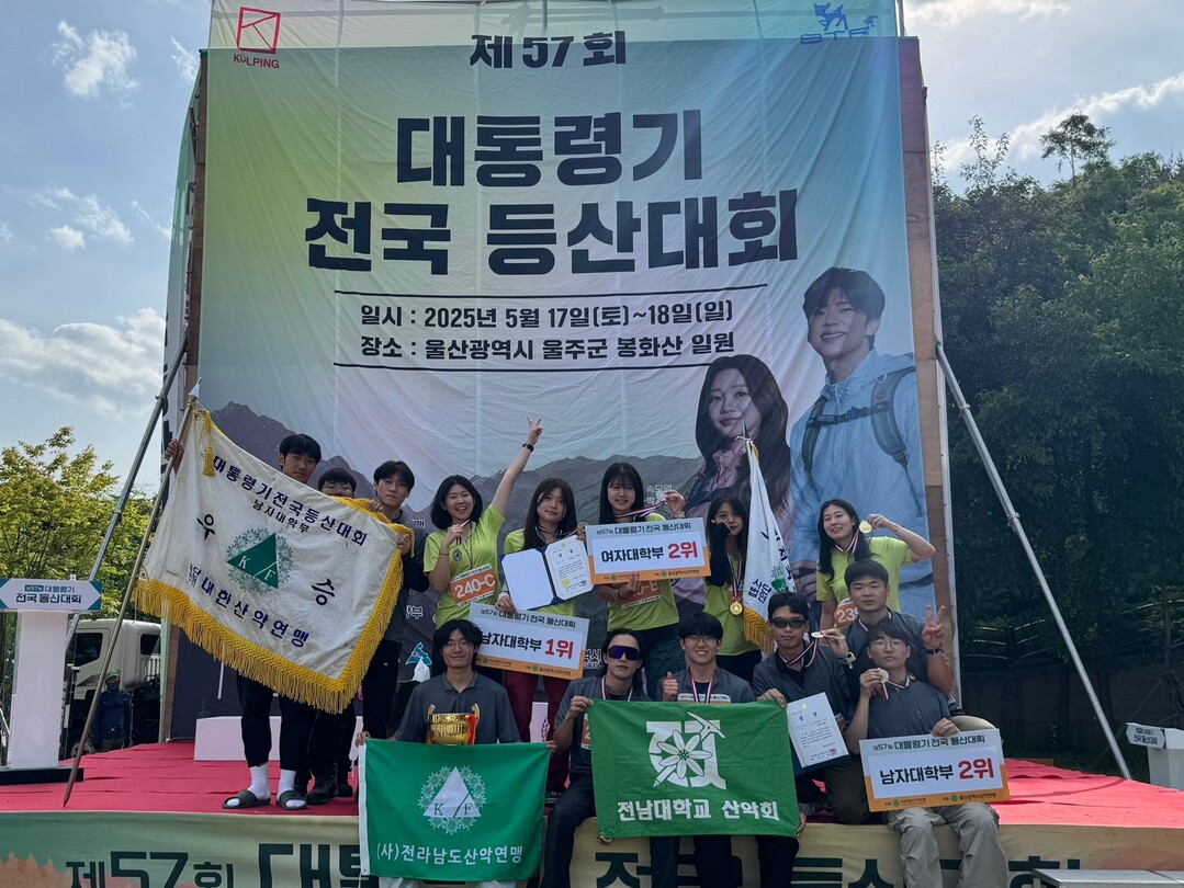[대학저널 이선용 기자] 전남대학교 산악회 선수들이 전국 최고 권위의 등산대회인 제57회 대통령기 전국 등산대회에서 남녀 대학부 1위와 2위를 모두 차지하며 압도적인 기량을 선보였다.