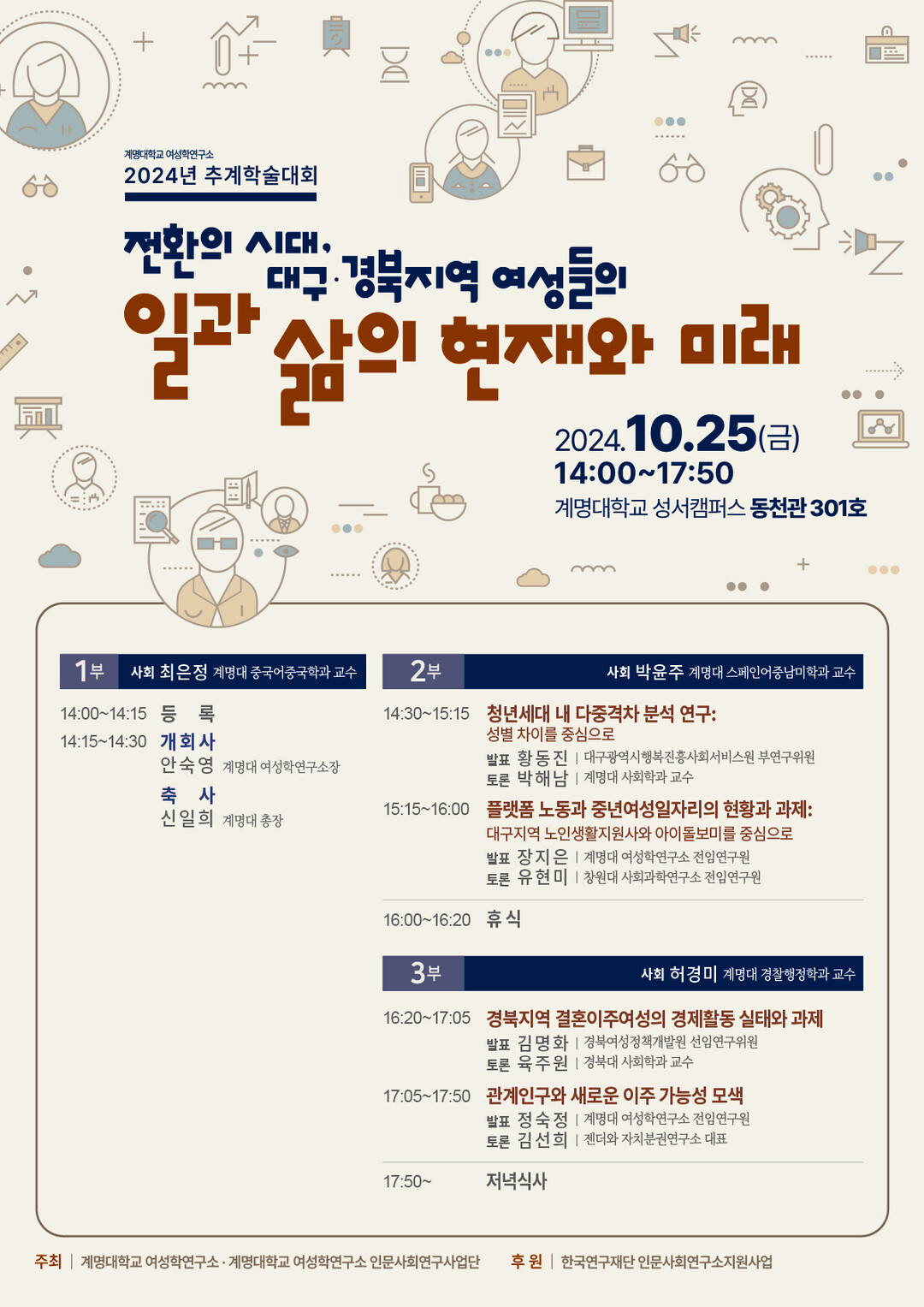 첫 번째 세션에서는 황동진 부연구위원(대구광역시행복진흥사회서비스원)이 "청년 세대 내 다중 격차 분석 연구: 성별 차이를 중심으로"를 주제로 발표한다. 이 연구는 대구 지역 청년 세대의 경제적 불안정, 주거 불안정, 정신 건강 문제 등을 다루며, 특히 여성 청년들이 겪는 경력 단절과 임금 격차 문제에 주목한다. 이어서 장지은 전임연구원(계명대 여성학연구소)이 "플랫폼 노동과 중년 여성 일자리의 현황과 과제"를 주제로 발표할 예정이다.