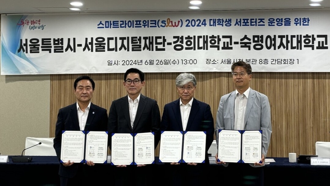 [대학저널 이선용 기자] 숙명여자대학교가 6월 26일 서울시청에서 서울시, 서울디지털재단, 경희대와 함께 서울 스마트라이프위크(SLW)의 대학생 서포터즈 운영을 위한 업무협약을 체결했다.