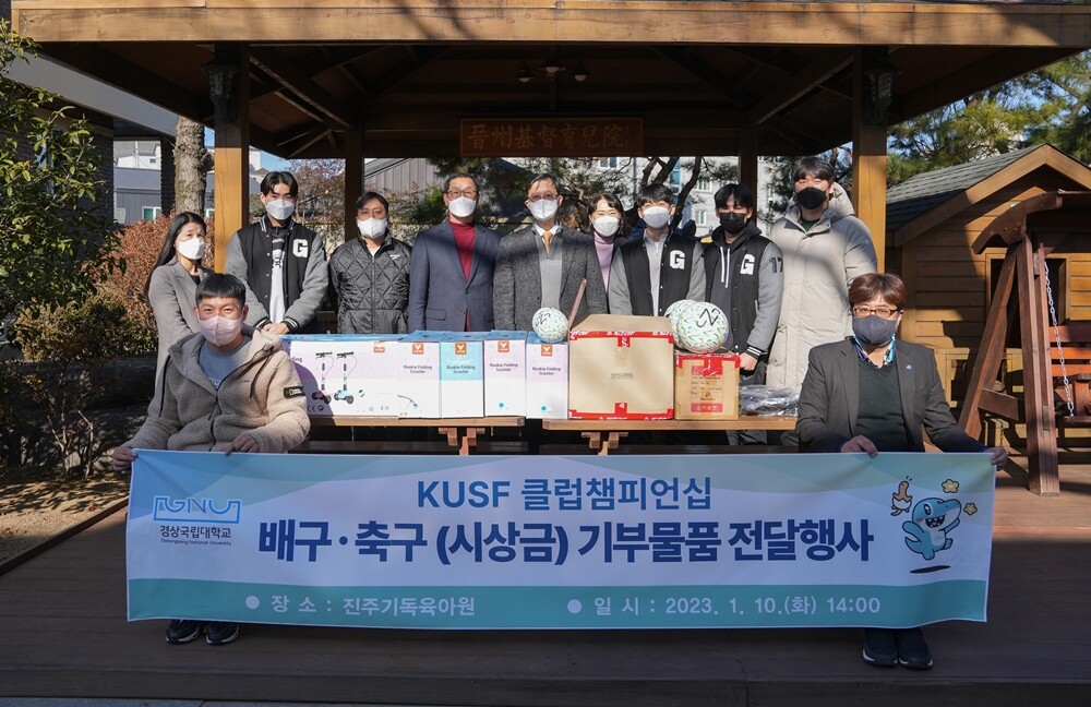 경상국립대 체육교육과는 지난 11월 한국대학스포츠협의회(KUSF)에서 주최한 전국대학생 클럽챔피언십2022에 참가해 입상한 상금 100만 원으로 체육용품을 구입해 10일 진주기독육아원에 전달했다. 경상국립대는 대회에서 배구 우승, 축구 3위의 성적을 거두었다.