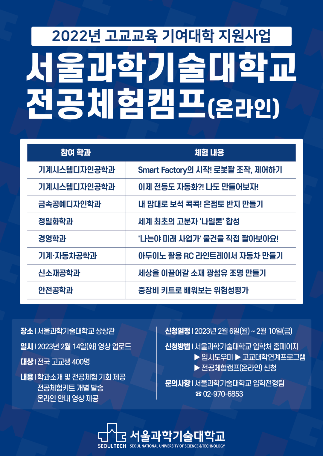 온라인 전공체험캠프 참가신청은 오는 6~10일 서울과기대 입학처 홈페이지에서 가능하다.