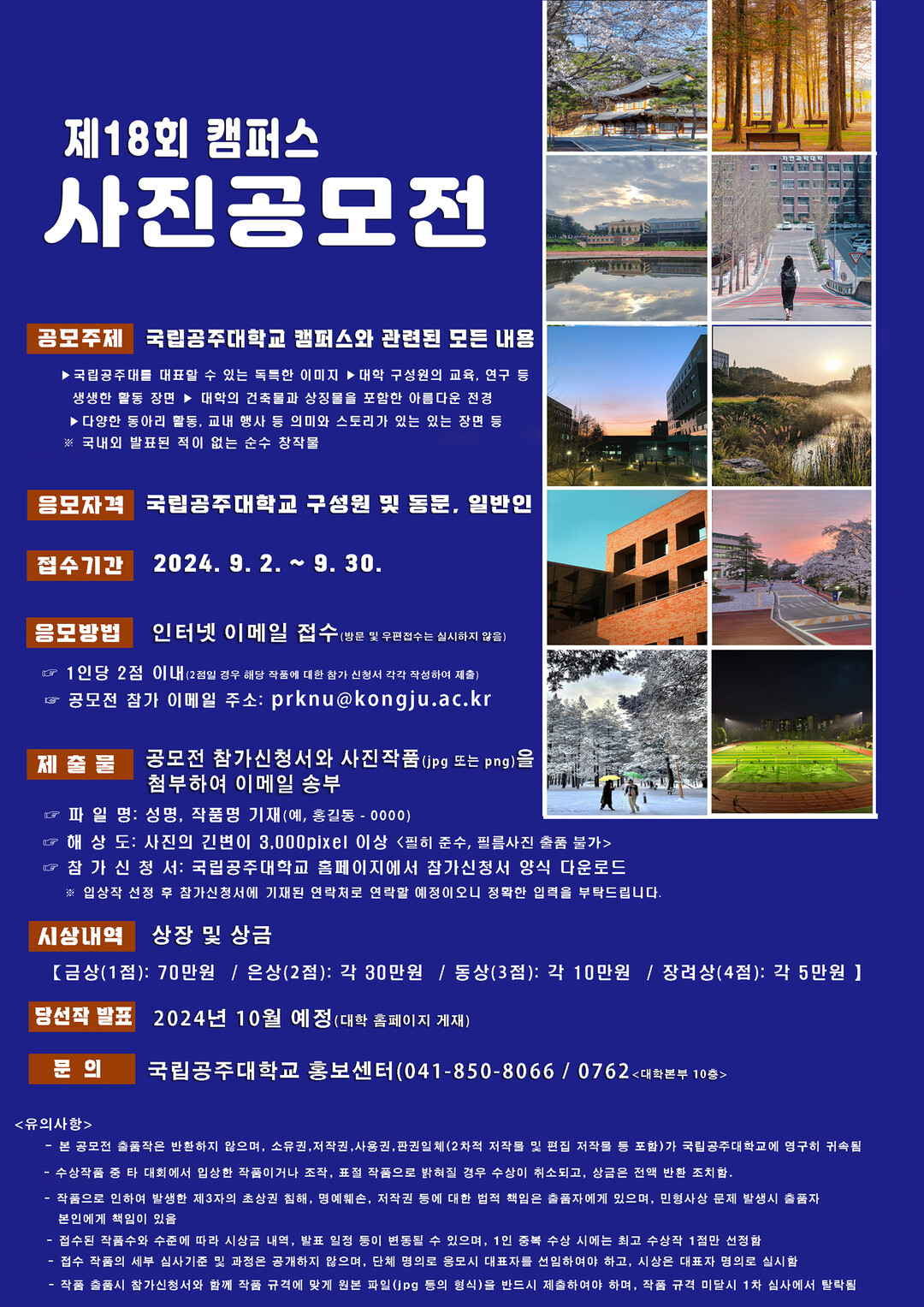 한편, 제18회 캠퍼스 사진공모전은 국립공주대학교 홈페이지에서 접수기간, 응모방법, 참가신청서 등 자세한 사항을 확인할 수 있다.