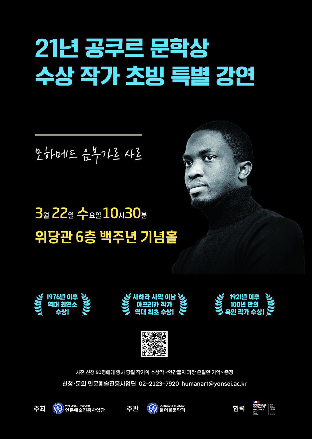 이번 특강은 모하메드 음부가르 사르 작가가 한국에 처음 방문하는 행사인 만큼 문화·예술계와 학계의 주목을 받고 있다. 세네갈 출신으로 프랑스 문단에서 활동하는 프랑스어권 작가로서 정체성과 문학의 보편성 사이의 갈등을 치열하게 성찰하는 음부가르 사르 작가와의 만남은 지역 사회의 학생과 연구자, 세계 문학에 관심 있는 독자에게 프랑스 문학의 새로운 흐름을 접하고 ‘프랑스어로 된 세계 문학’의 방향을 생각해 볼 기회가 될 것으로 기대된다.