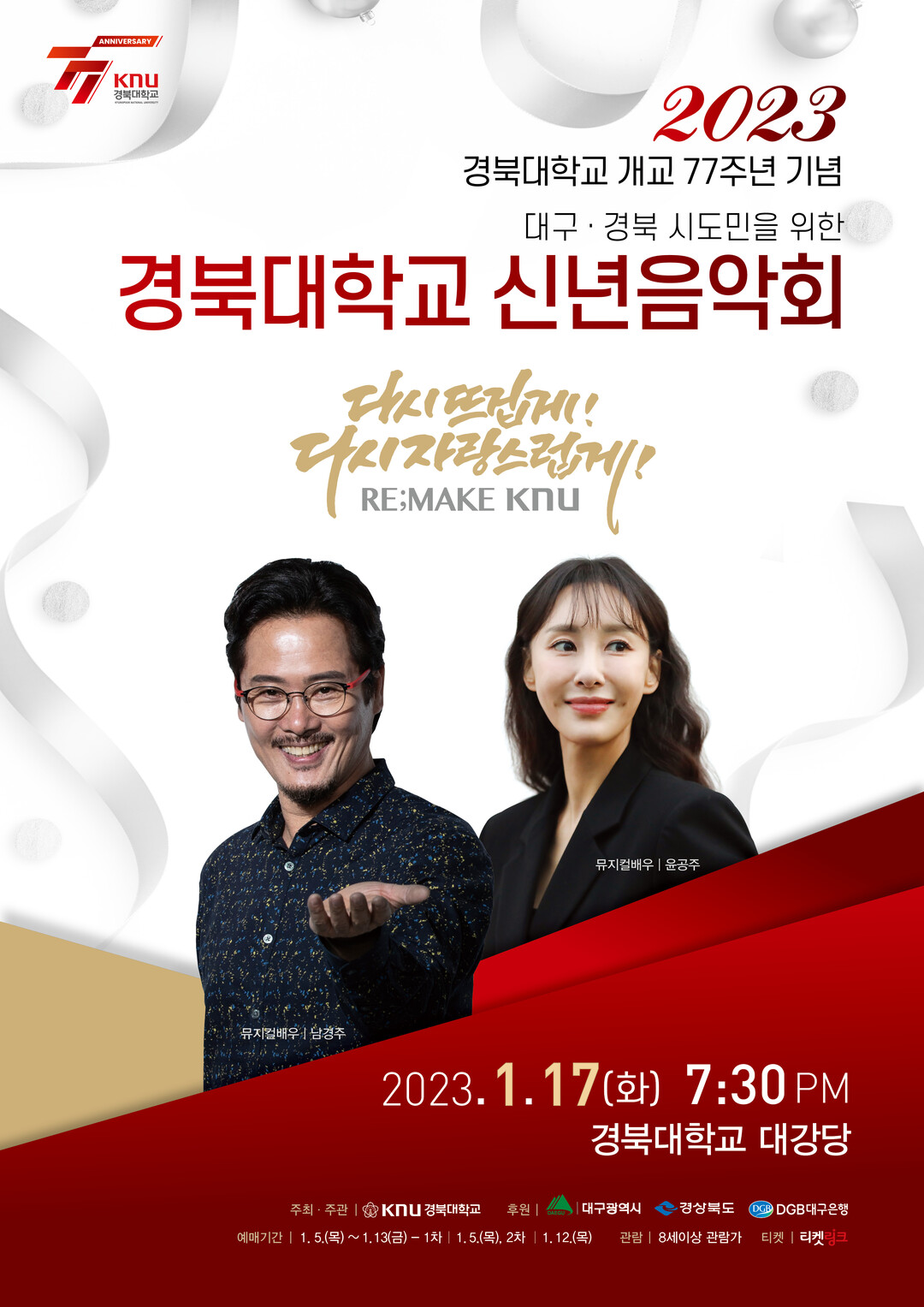 2일 경북대에 따르면 ‘다시 뜨겁게! 다시 자랑스럽게! RE;MAKE KNU’를 주제로 열리는 신년음악회에는 뮤지컬 시카고와 레미제라블 등의 주역을 맡은 뮤지컬 배우 남경주와 뮤지컬 지킬 앤 하이드, 아이다, 시카고 등에서 열연한 뮤지컬 배우 윤공주, 테너 서영철, 뮤지컬 배우 박혜민과 장홍석, 재즈보컬 벨라제이 등이 출연한다.