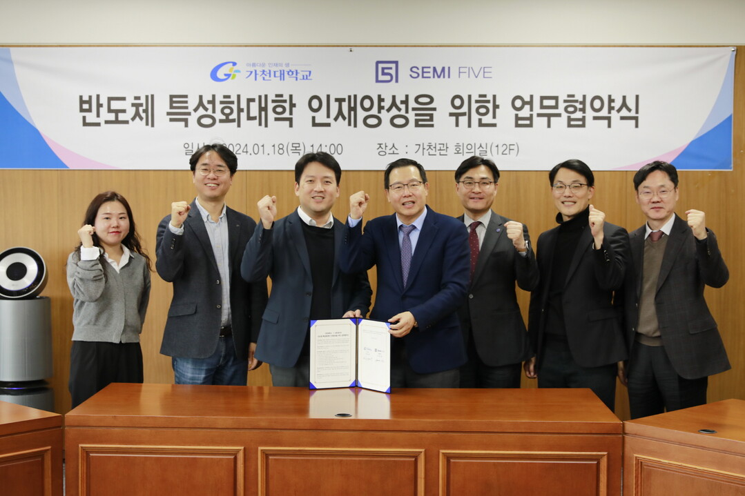 이날 협약식에는 가천대 윤원중 부총장과 박경수 기획처장, 반도체설계학과 오현석교수, 세미파이브 조명현 대표이사 등이 참석했다.