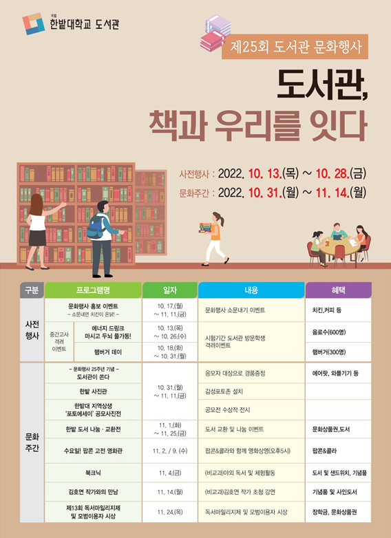 [대학저널 온종림 기자]한밭대학교는 오는 31일부터 11월 14일까지 2주간 ‘도서관, 책과 우리를 잇다’를 주제로 제25회 도서관 문화행사를 연다고 24일 밝혔다.