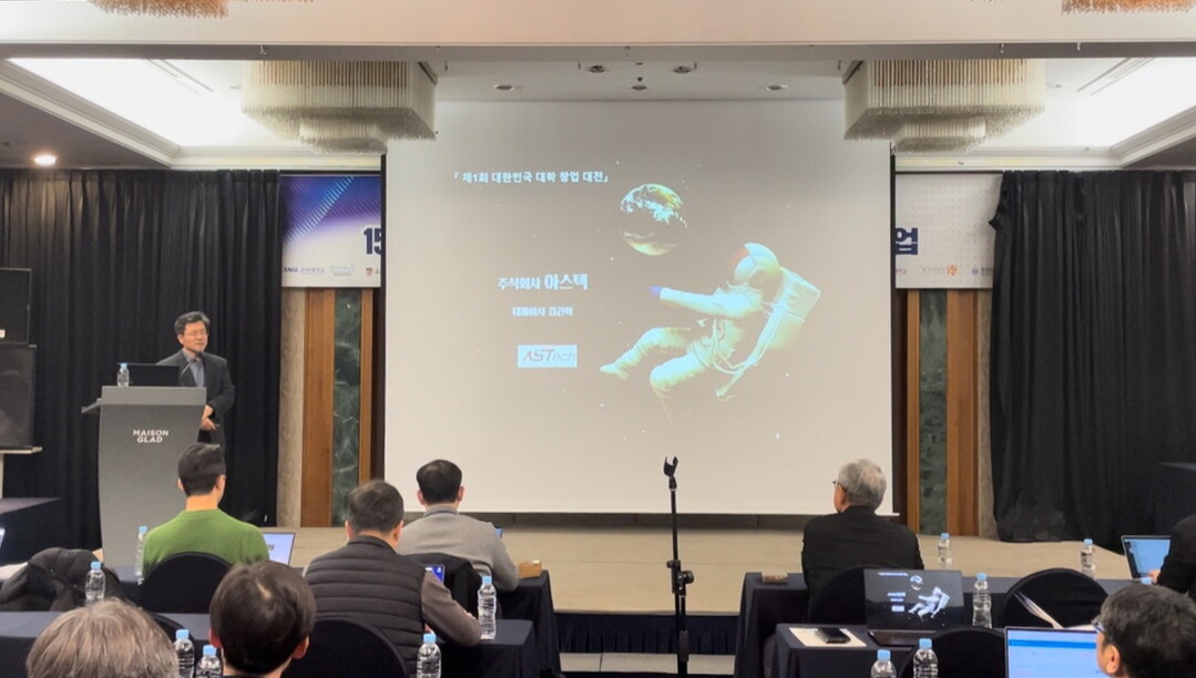 제1회 대한민국 대학 창업 대전에서 국립한밭대 교원창업기업 (주)아스텍 김건희 대표가 IR 발표를 하고 있다. 사진=국립한밭대 제공 |
