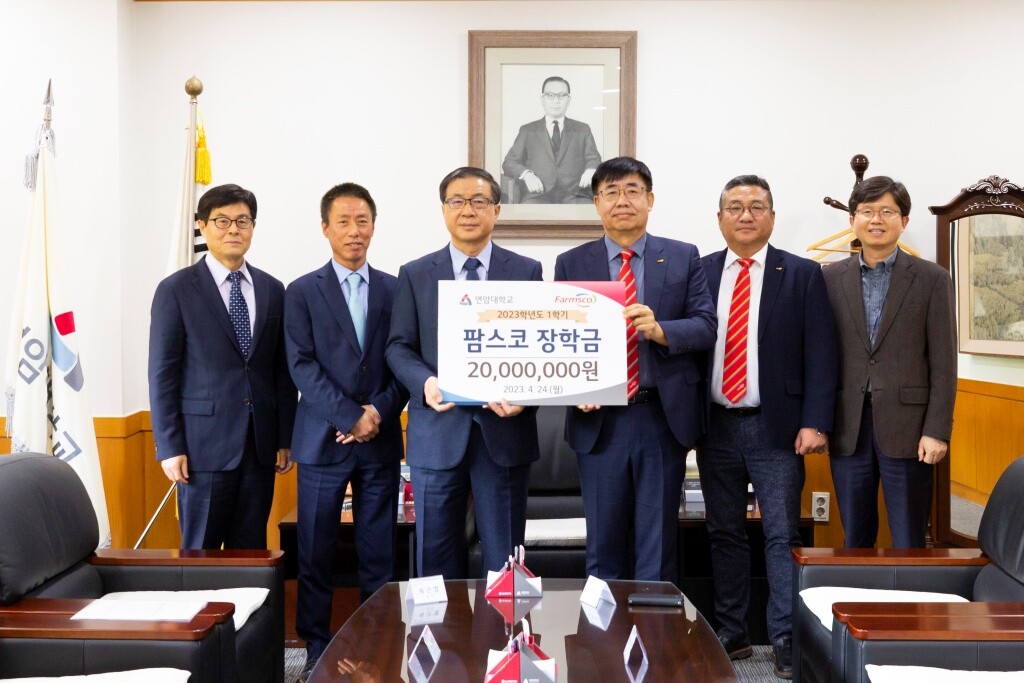 팜스코는 사료부터 양돈, 식육, 가공, 유통에 이르는 친환경 축산전문기업이다. 연암대 재학생의 학습역량을 강화하고 차세대 농업분야를 선도할 영농 기술인 양성을 후원하기 위해 2017년부터 현재까지 학기별 2천만원씩 7년간 총 260명의 학생에게 2억 6천만원의 장학금을 전달해오고 있다.