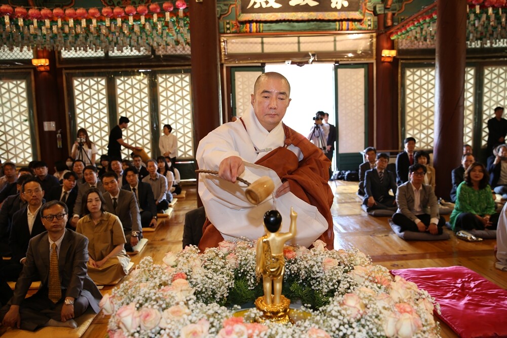 동국대 이사장 돈관스님이 관불의식을 하고 있다. 사진=동국대 제공 |