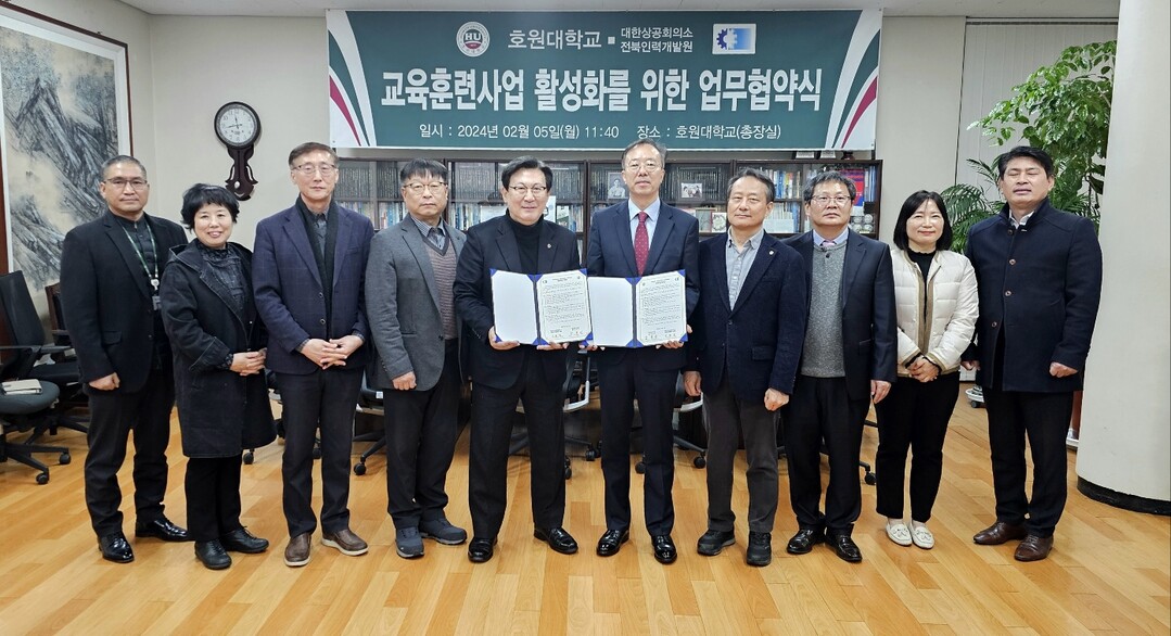 [대학저널 이선용 기자] 호원대학교가 5일 오전 11시 30분 호원대 총장실에서 대한상공회의소 전북인력개발원과 외국인 유학생 교육훈련 사업의 활성화와 교육프로그램 개발, 운영을 위한 업무협약을 체결했다.