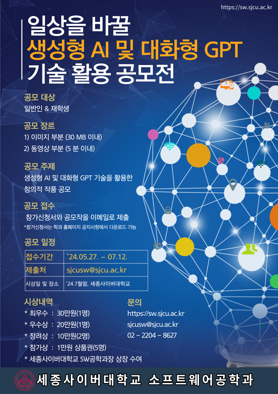 [대학저널 이선용 기자] 세종사이버대학교 소프트웨어공학과는 ‘생성형 AI 및 대화형 GPT 기술을 활용한 공모전’을 개최한다고 21일 밝혔다.