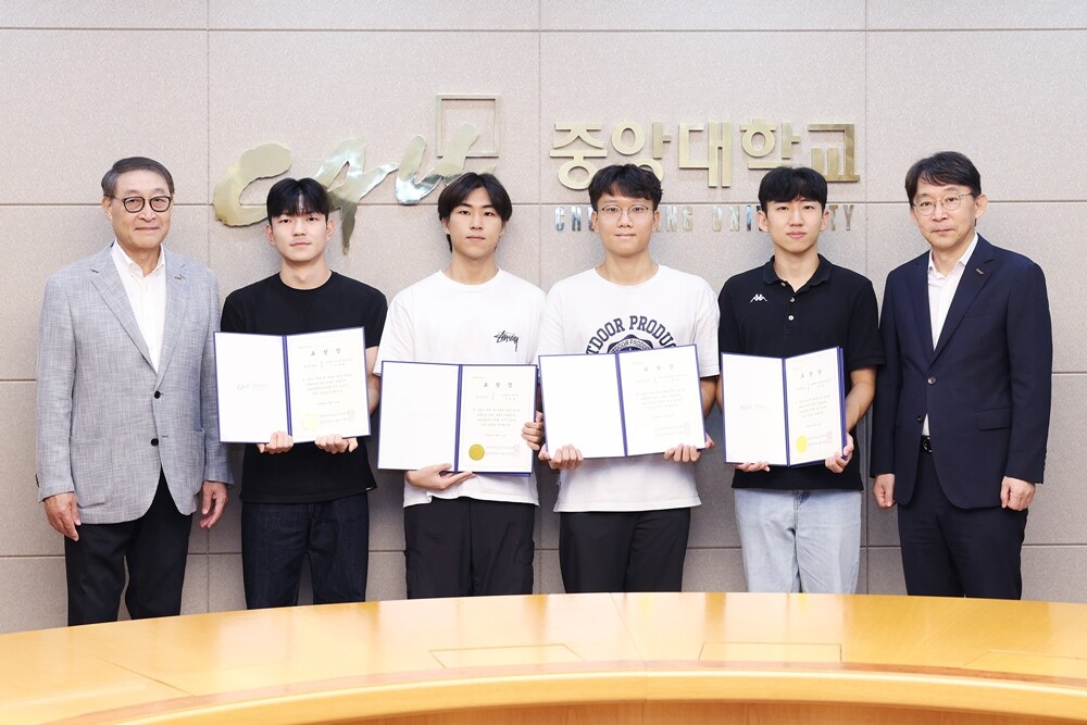 왼쪽부터 이현순 학교법인 중앙대학교 이사장, 이대환 학생, 구자록 학생, 고영욱 학생, 송기철 학생, 박상규 중앙대 총장. 사진=중앙대 제공 |