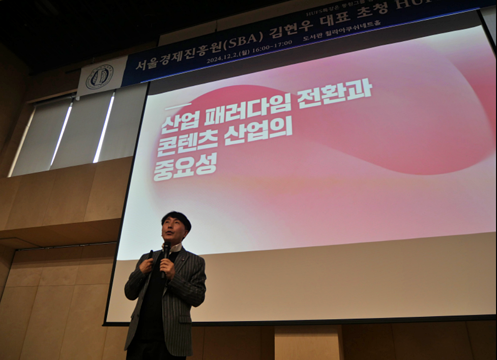 [대학저널 온종림 기자] 한국외국어대학교 대학일자리플러스본부가 지난 2일, 한국외대 도서관 휠라아쿠쉬네트홀에서 김현우 서울경제진흥원(SBA) 대표를 초청하여 ‘2024 HUFS 특강’을 개최했다.