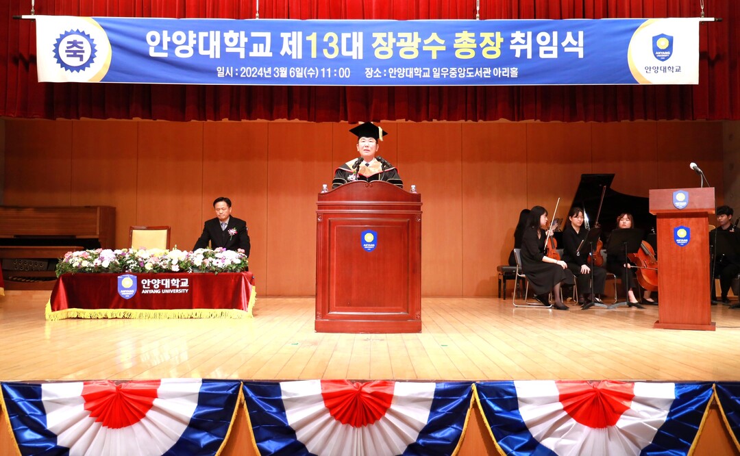 장광수 총장은 취임사를 통해 “중차대한 시기에 안양대의 13대 총장으로 취임하게 되어 무한한 영광과 함께 막중한 책임감을 느낀다”며 “소통과 화합, 혁신과 창의의 조직문화를 통해 ‘지역과 함께하는 대학, 미래와 함께하는 대학, 세계와 함께하는 대학’을 만들어 가겠다”고 밝혔다.