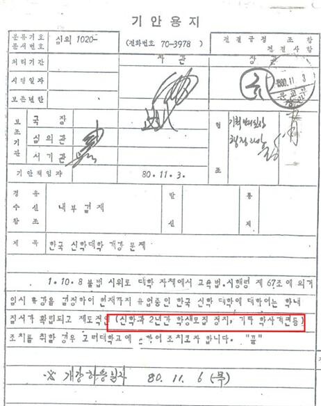 한신대 신학과 모집중지 강제조치 관련한 당시 문교부 내부결재 문서: 「한국신학대학 개강 문제」(1980.11.3.) (국가기록원) / 자료출처: ‘진실화해위원회’ 보도자료(2025.1.14.) 붙임 4. |