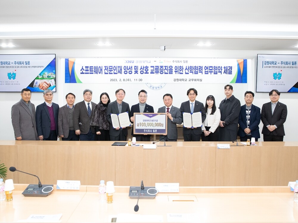 [대학저널 온종림 기자] 강원대학교가 8일 대학본부에서 주식회사 틸론과 소프트웨어 전문인재 양성 및 상호 교류 증진을 위한 산학협력 업무협약을 체결했다.