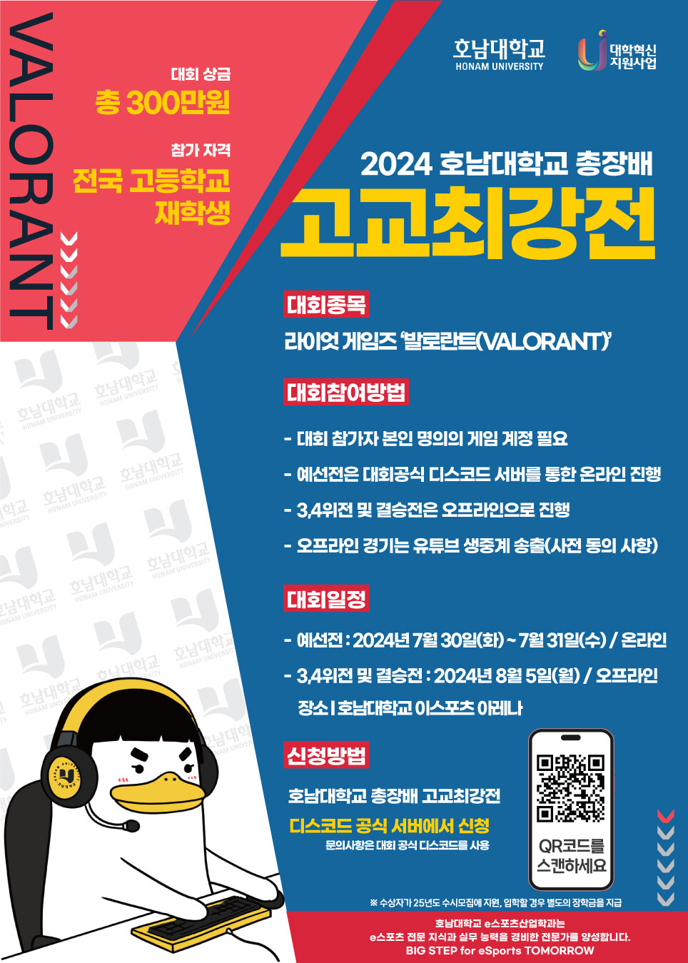 참가 대상은 전국 고등학교 재학생들로, 5명이 한팀을 이뤄 학교의 명예를 걸고 FPS 인기 종목인 발로란트(VALORANT)로 실력을 겨룬다.