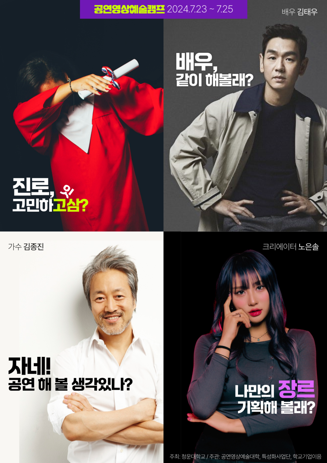 이번 캠프에서 더욱 눈에 띄는 것은 배우 김태우, 가수 김종진, 영화감독 박건용, 크리에이터 노은솔 등이 함께 한다. 이들과 함께 마스터클래스(특강) 시간을 마련해 풍부한 현장 경험과 노하우가 전달될 예정이다.