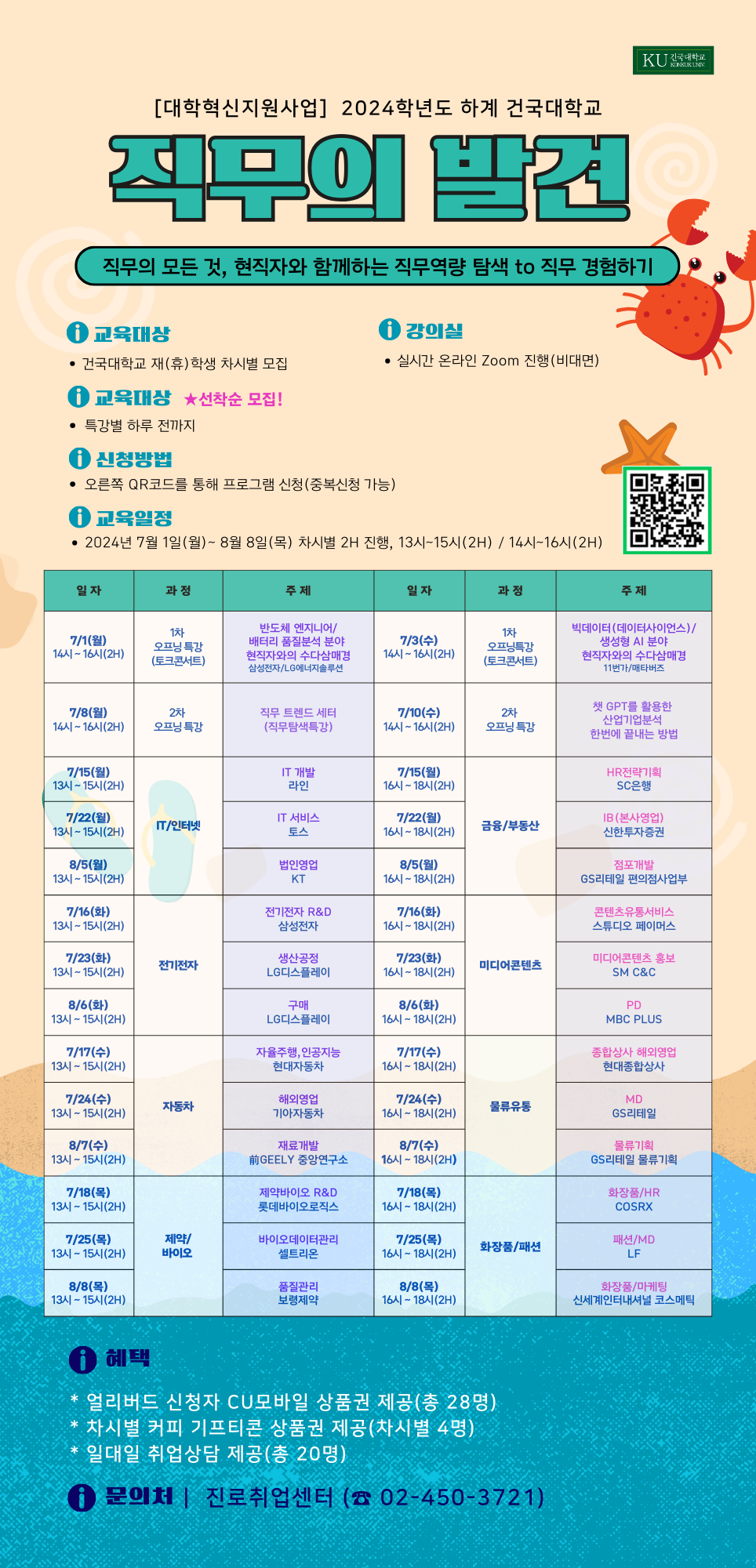 ‘직무의 발견’ 프로그램은 7월 1일(월) 현직자 토크 콘서트를 시작으로 7월 15일부터 8월 8일까지 3주간 8개 산업 24개의 직무가 다뤄지는 온라인 직무 박람회이다.