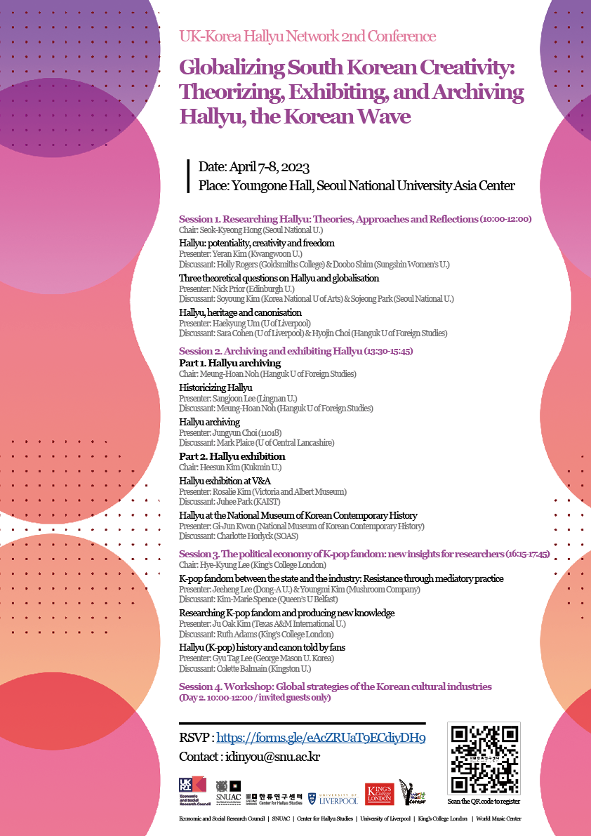 또한 영국 빅토리아 앨버트 박물관에서 ’Hallyu! The Korean Wave‘같은 한류 전시가 이뤄지고 있는 가운데, 이 콘퍼런스에서는 한류를 일종의 문화유산으로 아카이빙하고 전시하려는 노력에 대해 한국과 영국의 사례를 중심으로 살펴보는 자리가 마련될 계획이다.