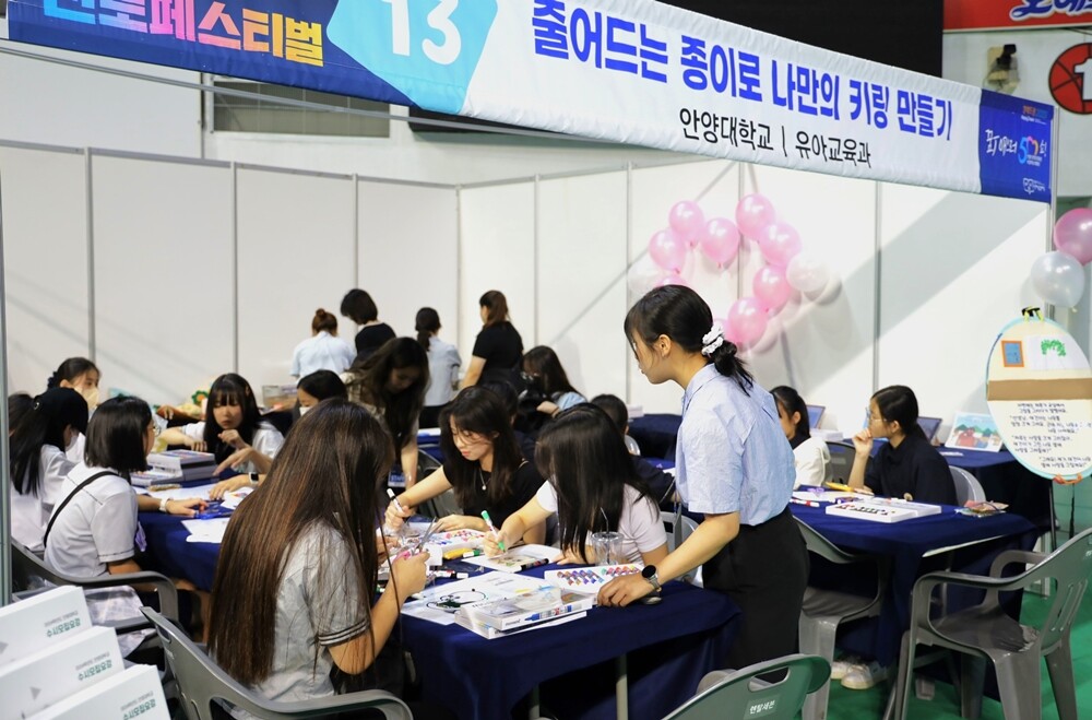 안양대는 7일과 8일 안양시 안양종합운동장 실내체육관에서 열리는 ‘제8회 안양시 진로페스티벌’에 유아교육과와 화장품발명디자인학과 게임콘텐츠학과 등 3개 학과가 참여해 학생들을 위한 학과 체험 활동을 하고 있다.