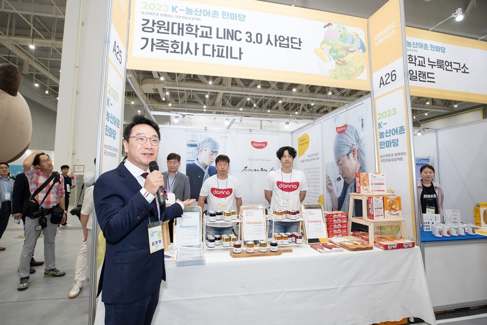 김헌영 강원대 총장이 경기도 수원컨벤션센터에서 열린 2023 K-농산어촌 한마당에서 대학과 지역기업의 산학협력을 통해 개발한 제품을 소개하고 있다. 사진=강원대 제공 |