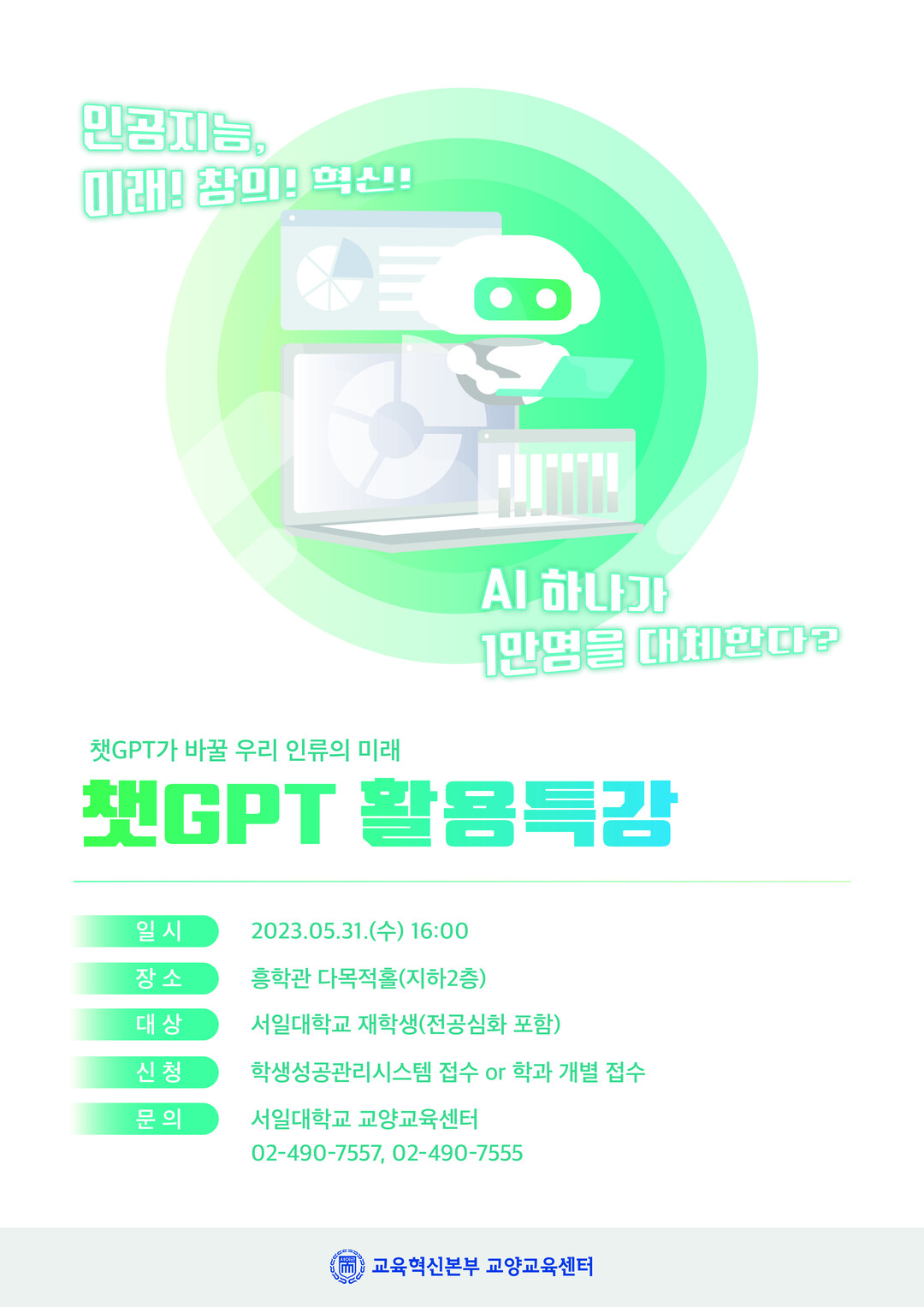 | 지난달 31일 서일대에서 열린 “챗GPT가 바꿀 우리 인류의 미래, 챗GPT활용" 특강 포스터. 자료=서일대 제공 |
