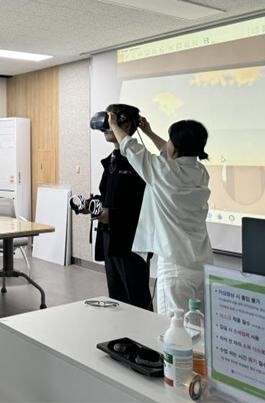청주 신흥고등학교 학생이 생활과학대학 주거환경학과를 방문해 3D 모델링 작품과 VR체험을 진행하고 있다. 사진=충북대 제공 |