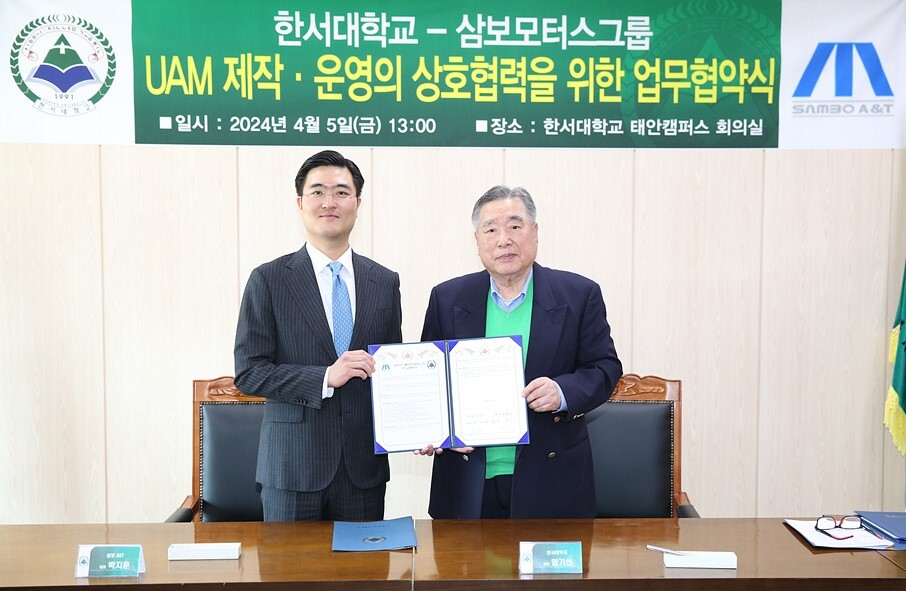 [대학저널 온종림 기자] 한서대학교가 5일 삼보모터스그룹 삼보에이앤티(주)와 UAM(도심항공교통) 제작ㆍ운영의 상호협력을 위한 업무 협약(MOU)을 체결했다.