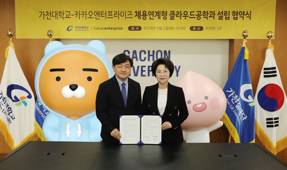 [대학저널 온종림 기자] 가천대학교와 카카오엔터프라이즈는 2일 대학 가천관에서 '가천대–카카오엔터프라이즈 간 계약학과 운영협약’을 체결하고 클라우드 분야 채용과 연계한 전문인력 양성에 나선다.