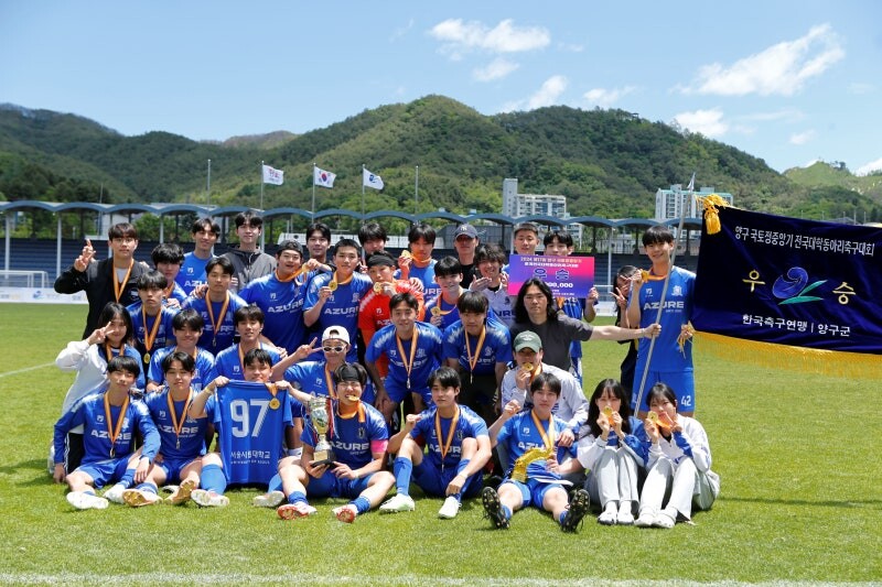 [대학저널 온종림 기자] 서울시립대학교 남자축구부 ‘AZURE’가 지난 5월 28일 제17회 양구 국토정중앙기 전국대학동아리축구대회에서 우승을 차지했다. 이번 우승은 특히 지난 5월 24일 서울시립대 남자축구부 창단식 직후 첫 대회에서 거둔 성과라 그 의미가 더욱 크다.