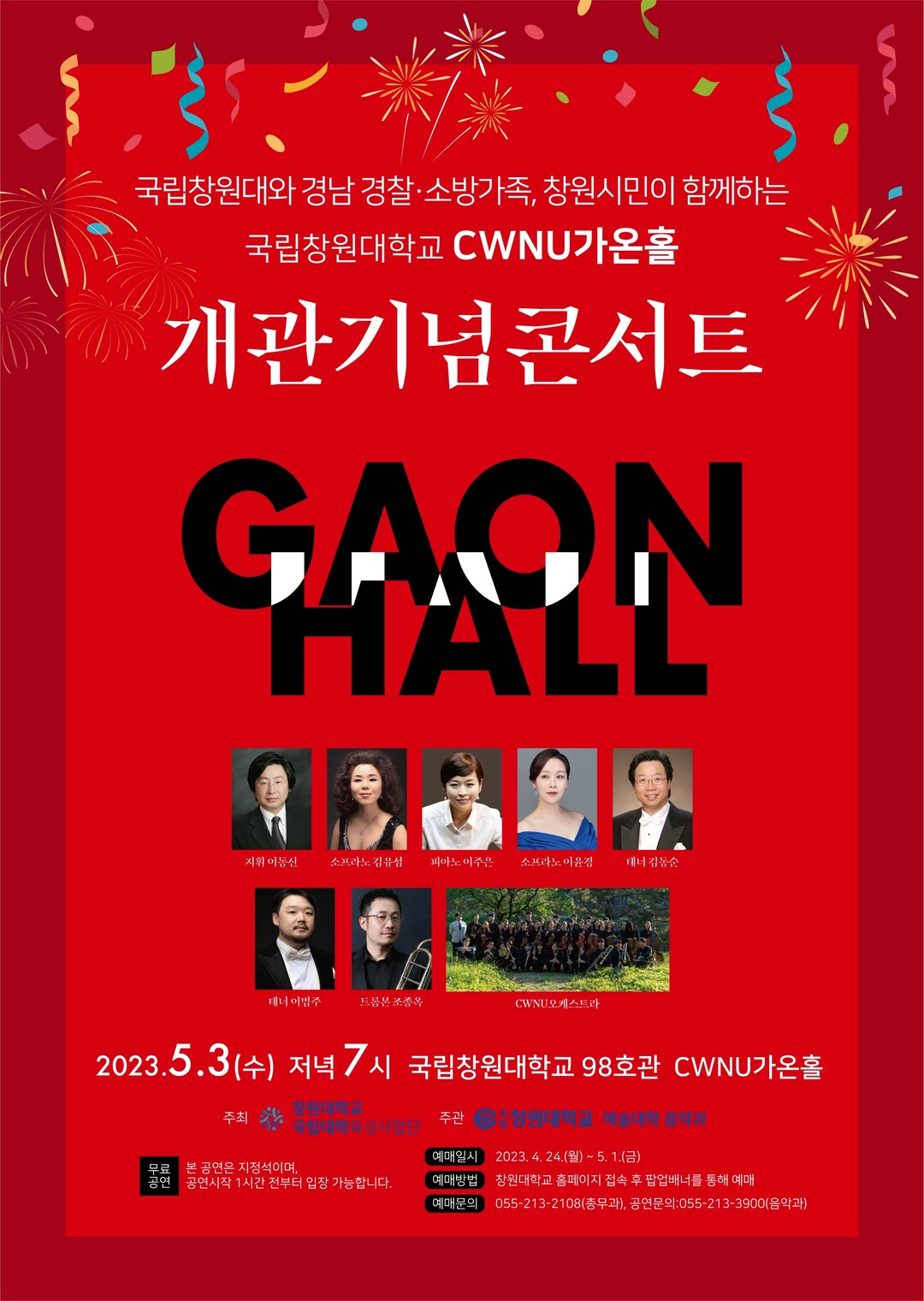 콘서트는 시민 누구나 무료로 관람이 가능하며, 초대권 예매는 24~5월 1일까지 창원대 홈페이지) 접속 후 팝업 배너를 클릭해 신청하면 선착순으로 배부된다.