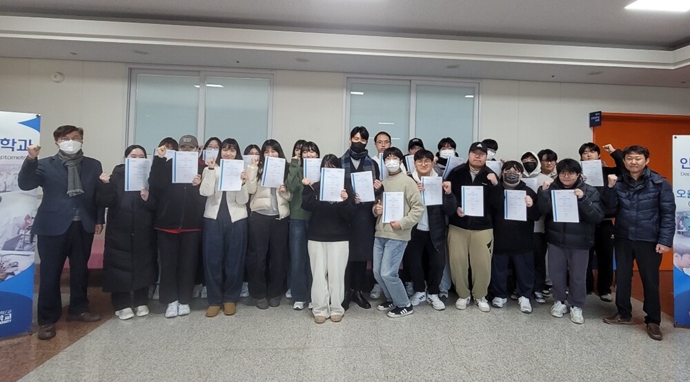 경동대 안경광학과 학생 32명이 올해 국제콘택트렌즈교육자협의회 STE인증에 전원 합격했다. 사진=경동대 제공 |