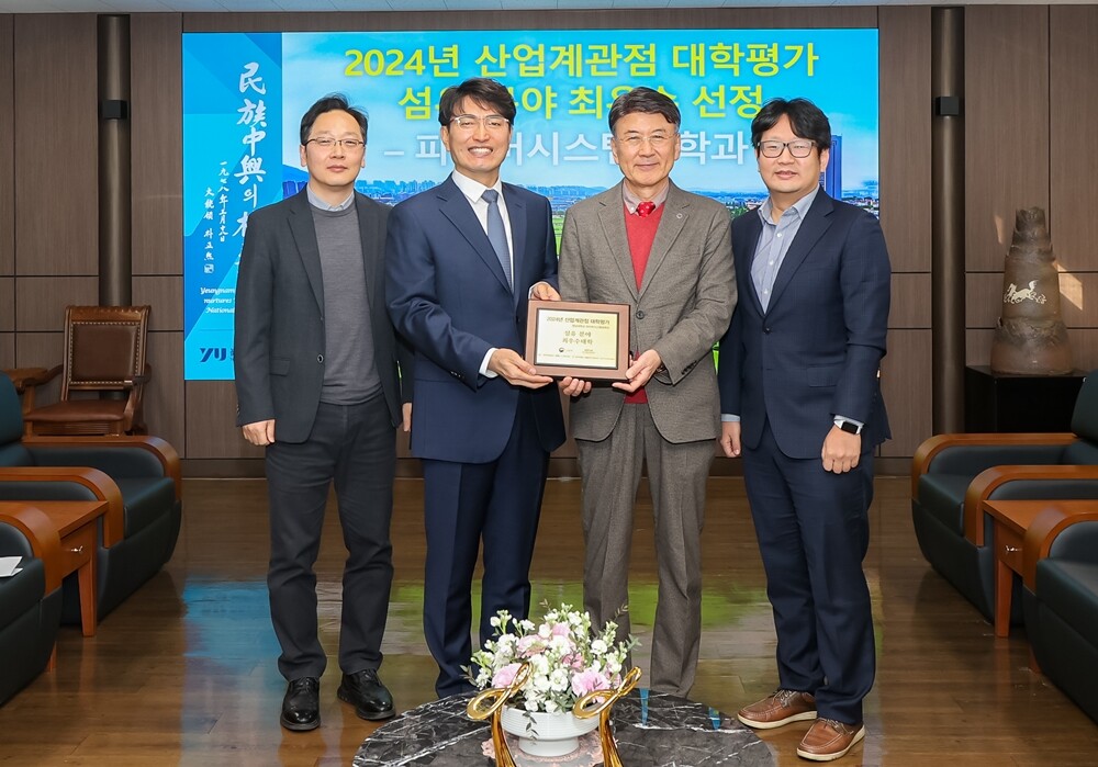 영남대 파이버시스템공학과가 ‘2024년 산업계관점 대학평가’에서 최우수 학과에 선정됐다. 왼쪽에서 두 번째부터 파이버시스템공학과 이재웅 교수(학과장), 최외출 총장. 사진=영남대 제공 |