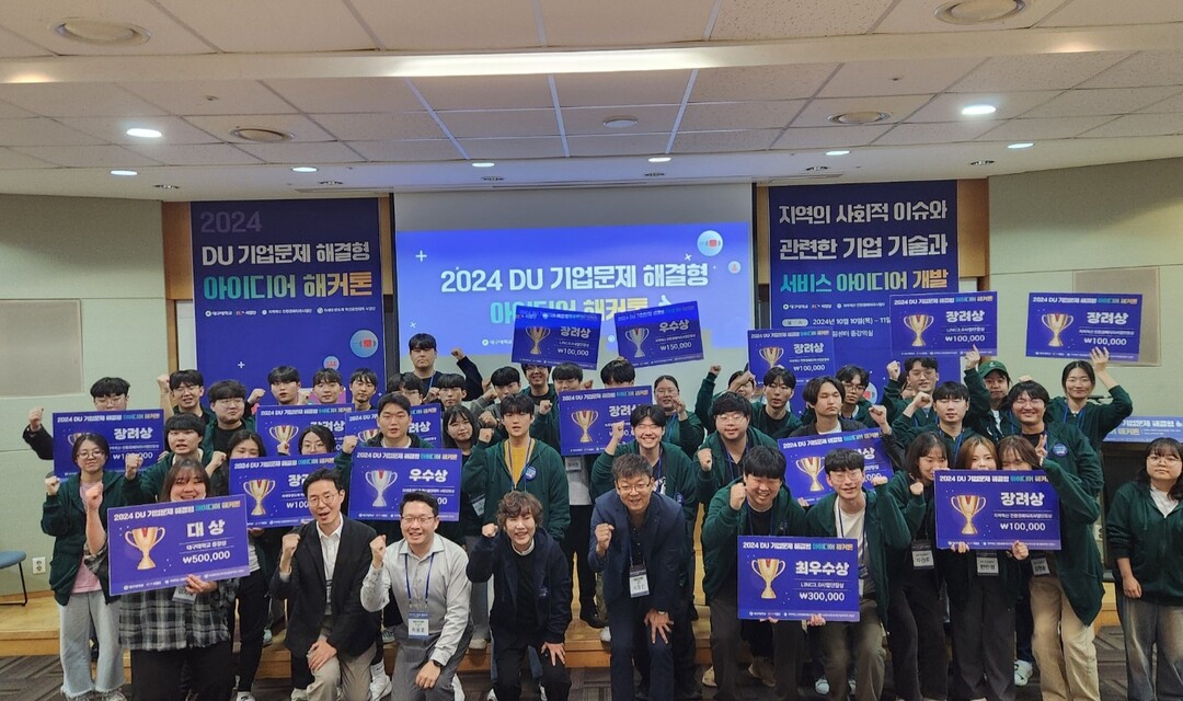 2024 DU 기업문제 해결형 아이디어 해커톤 참석자들이 기념촬영을 하고 있다. 사진=대구대제공 |
