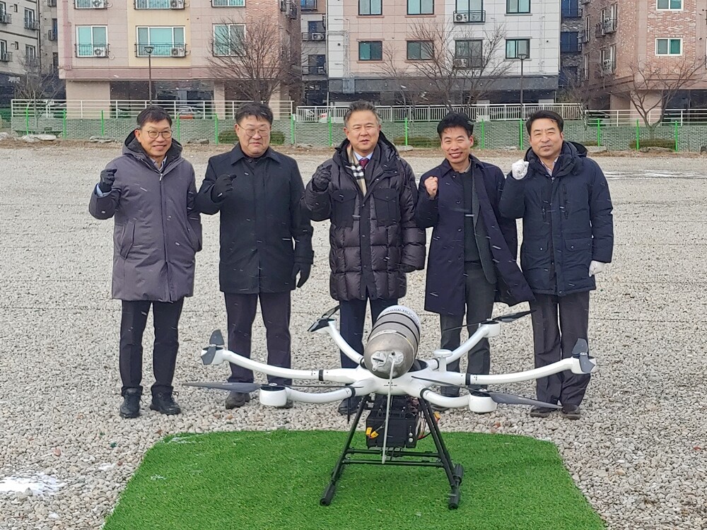 평택대 이동현 총장(가운데), 이기상 산학부총장(왼쪽 첫번째) 등이 액화수소연료전지 드론 앞에서 교육원의 성공을 다짐하고 있다. 사진=평택대 제공 |