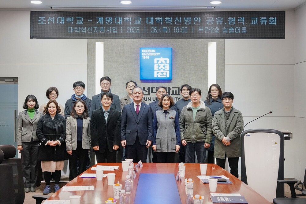 조선대는 지난 26일 본관 청출어룸에서 계명대와 대학혁신, 교육시설 공유 등을 위한 업무 교류회를 진행했다. 교류회에는 최명숙 계명대 교육혁신처장, 김경호 교육혁신부처장 등과 민영돈 조선대 총장, 조규만 교육혁신원 부원장, 권구락 대학혁신사업지원센터장 등이 참석했다.