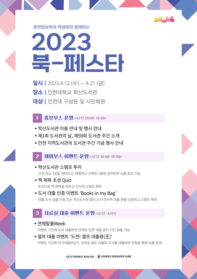 이 대학 학산도서관이 주최하는 2023 북-페스타에는 인천대 구성원은 물론 인천시민 회원 누구나 참여할 수 있다.