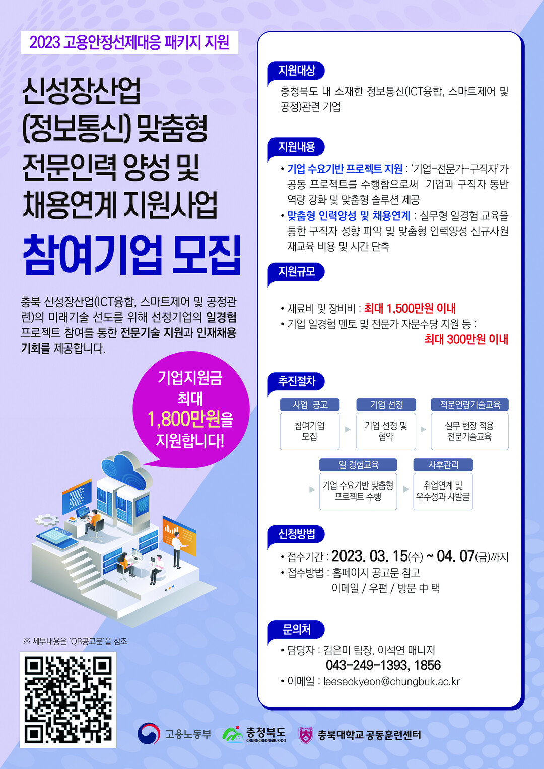 연선미 충북대 공동훈련센터장은 “충북 신성장산업의 구인·구직 미스매치를 해소하고자 기업 주도 맞춤형 인재를 양성할 수 있도록 특화된 일 경험(프로젝트) 교육을 진행해 채용연계와 지역 고용을 안정화하는데 기여할 수 있도록 노력하겠다”며 기업들의 적극 참여를 당부했다.