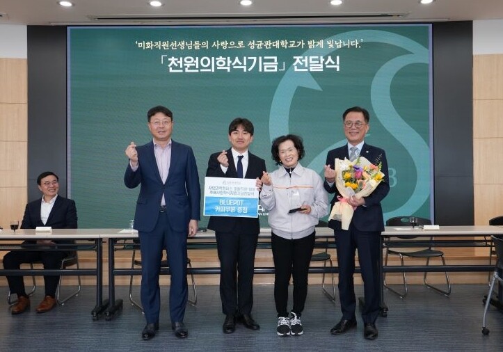 주영수 상임이사, 정영기 자과캠 총학생회장, 신옥순 미화소장, 유지범 총장(왼쪽부터)이 기념사진을 촬영하고 있다. 사진=성균관대 제공 |